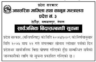 काठमाडौँ -प्रदेश नम्बर ३ ले मंगलबार सार्वजनिक विदा दिएको छ। माघ ९ मा बसेको प्रदेश मन्त्रिपरिषद बैठकले सोनाम ल्होसार पर्वका दिन विदा दिने निर्णय गरेको थियो। प्रदेश ३ को आन्तरिक मामिला तथा कानून मन्त्रालयले सोमबार गोरखापत्रमा सूचना निकालेर मंगलबार सार्वजानिक विदा दिएको उल्लेख गरेको छ। यसअघि प्रदेश ३ ले माघ १६ गते सहीद दिवसका दिन पनि विदा दिएको थियो। प्रदेशले दिएको विदामा केन्द्र सरकार मातहतका कार्यालय भने खुला रहन्छन्।