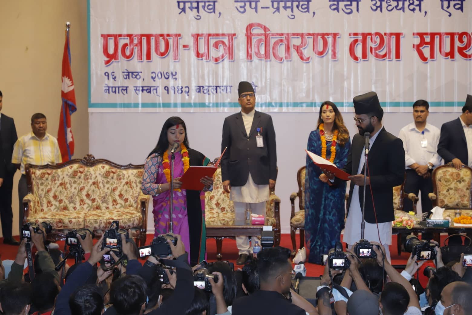 काठमाडौं : काठमाडौं महानगरपालिकाका नवनिर्वाचित मेयर उपमेयर बालेन साह र सुनिता डंगोलले पद तथा गोपनीयताको शपथग्रहण गरेका छन्। शपथग्रहण समारोहमा दौरा, सुरुवाल, कालो टोपी र कालो चस्मामा ठाँटिएर पुगेका बालेनसँगै उनकी पत्नी सबिना काफ्ले पनि सहभागी थिइन्।