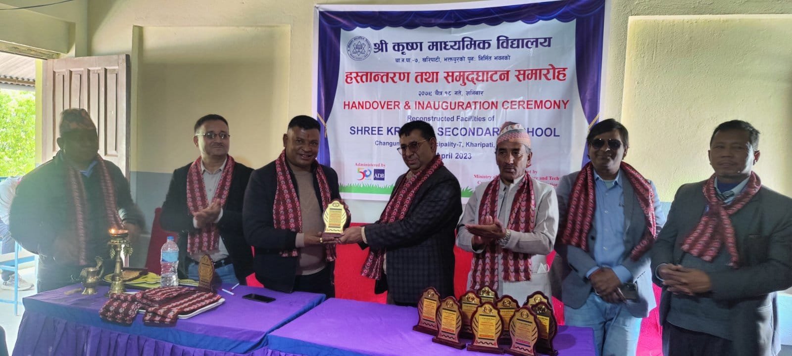 भक्तपुर । शिक्षा, विज्ञान तथा प्रविधि मन्त्रालय अन्र्तगतको केन्द्रीय आयोजना कार्यान्वयन इकाईको सहयोगमा चाँगुनारायण नगरपालिकाको खरिपाटीस्थित श्री कृष्ण माविको ८ कोठे भबन निर्माण सम्पन्न भएको छ । एक कार्यक्रमकाबीच चाँगुनारायण नगरपालिकाका नगर प्रमुख जीवन खत्रीको प्रमुख आतिथ्यमा नवनिर्मित भवन हस्तान्तरण कार्यक्रम सम्पन्न भएको विद्यालय व्यवस्थापन समितिका अध्यक्ष निरन्जन बजगाईले जानकारी दिएका छन् ।