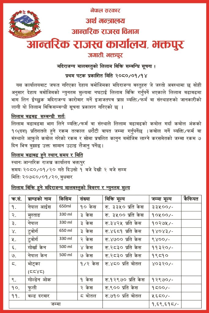 आन्तरिक आन्तरिक राजश्व कार्यालय भक्तपुरयस कार्यालयबाट जफत गरिएका देहाय बमोजिमका मदिराजन्य बस्तुहरु जे जस्तो अवस्थामा छ सोही अनुसार देहाय बमोजिमको न्युनतम मुल्यमा नघटाई लिलाम विक्रि गर्नुपर्ने भएकाले लिलाम बढाबढमा भाग लिन ईच्छुक मदिराजन्य कारोबार गर्ने इजाजतपत्र प्राप्त व्यक्तिर फर्म वा संस्थाहरुको जानकारीको लागी यो लिलाम बिक्रिसम्बन्धी सूचना प्रकाशन गरिएको छ ।