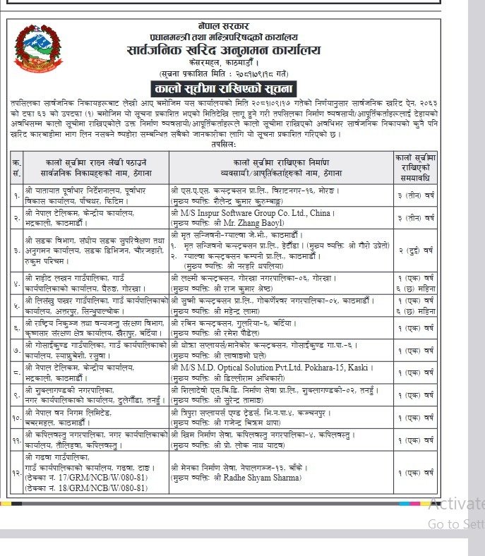 सूचनामा सार्वजनिक खरिद ऐन २०६३ को दफा ६३ (१) अनुसार १२ कम्पनीहरूलाई कालोसूचीमा राखिएको उल्लेख गरिएको छ।