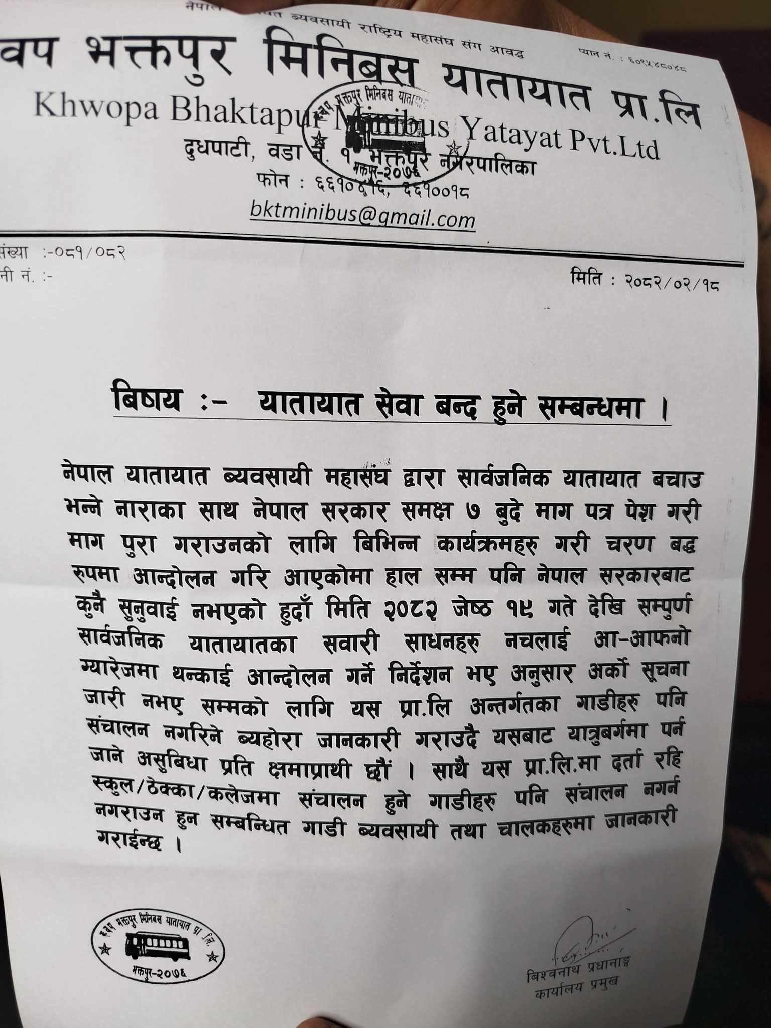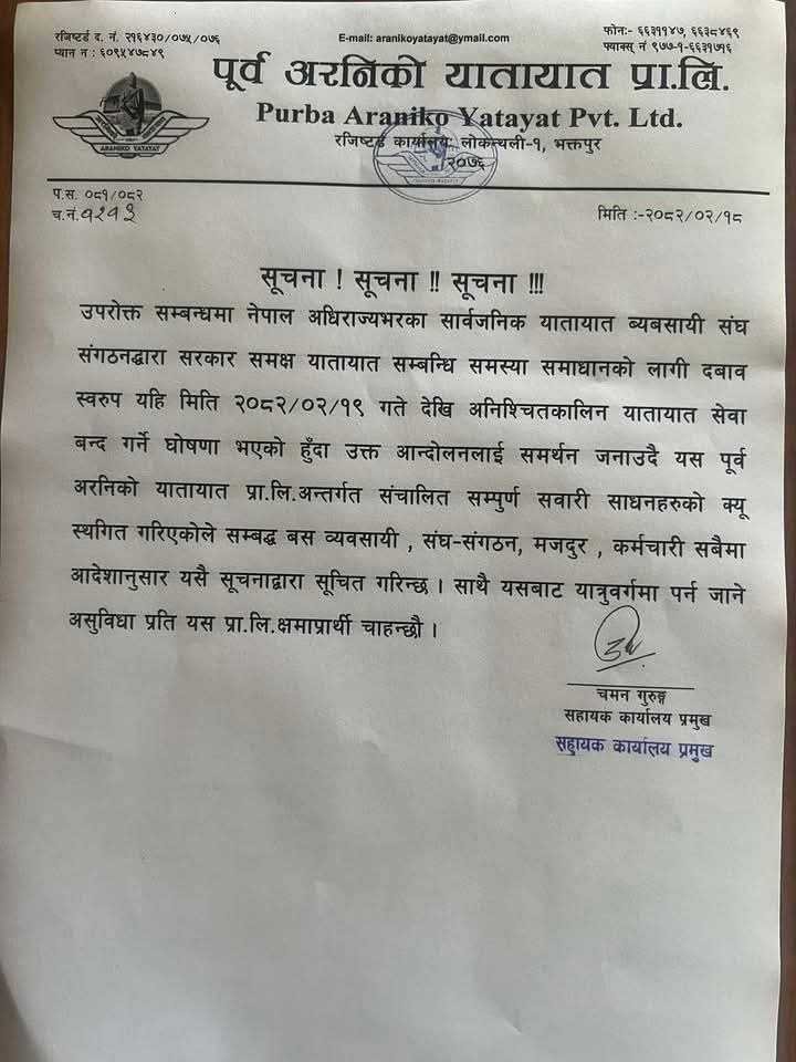 काठमाडौं । देशभरका यातायात व्यवसायीले सोमबारदेखि अनिश्चितकालीन यातायात बन्दको घोषणा गरेका छन् । ‘सार्वजनिक यातायात बचाउ केन्द्रीय संघर्ष समिति’को आह्वानमा सोमबारदेखि देशभरका सार्वजनिक यातायात ग्यारेजमै थन्क्याएर बस्ने निर्णय भएको पत्र विभिन्न यातायात व्यवसायीहरुले सार्वजनिक गरिहरेका छन् ।
