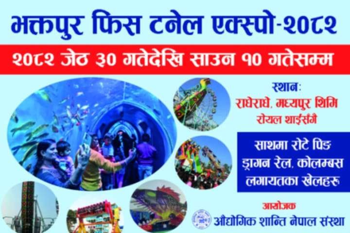 भक्तपुर । भक्तपुरमा भोली शुक्रबारबाट फिस टनेल एक्स्पो २०८२’ हुने भएको छ । मध्यपुरथिमि नगरपालिकाको राधेराधेमा भक्तपुर फिस टनेल एक्स्पो–२०८२ हुने आयोजक औद्योगिक शान्ति नेपाल संस्थाका अध्यक्ष सन्दिप महतले जानकारी दिएका छन् । राधेराधेमा रहेको रोयलथाई हस्पिटालिटीसंगै यो जेठ ३० गतेबाट सुरु भएर एक्स्पो २०८२ साउन १० गतेसम्म संचालनन हुनेछ ।