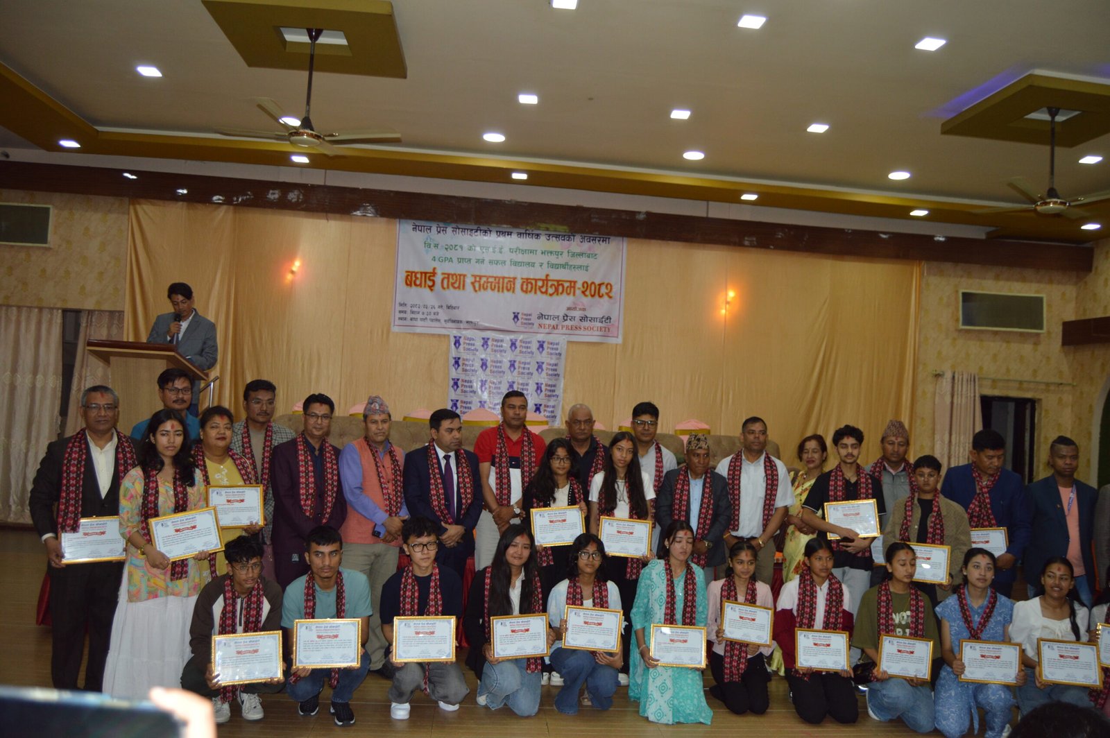 भक्तपुर । नेपाल प्रेस सोसाइटीको प्रथम वार्षिकोत्सव आज एक विशेष समारोहबीच सम्पन्न भएको छ। कार्यक्रमको अवसरमा भक्तपुर जिल्लाभरबाट ४ जीपीए ल्याउने ३० जना विद्यार्थीलाई सम्मानपत्र र प्रमाणपत्र वितरण गरिएको छ। समारोहका प्रमुख अतिथि प्रतिनिधिसभा सदस्य दुर्लभ थापाले नेपाल प्रेस सोसाइटीले एक वर्षको छोटो अवधिमा पत्रकारिता क्षेत्रमै उल्लेखनीय काम गरेको भन्दै प्रशंसा गरेका छन् । उनले भने, “यो केवल एक वर्षको यात्रा भए पनि सोसाइटीले पत्रकारिता र सामाजिक उत्तरदायित्व दुबै क्षेत्रमा सकारात्मक पहिचान बनाएको छ।” थापाले सम्मानित विद्यार्थीहरूको यो मोड जीवनको टर्निङ्ग प्वाइन्ट हुने उल्लेख गर्दै उच्च शिक्षाको यात्रामा सफलता प्राप्त होस् भन्ने शुभकामना समेत व्यक्त गरे। कार्यक्रममा भक्तपुरका प्रमुख जिल्ला अधिकारी भरतमणि पाण्डे, नेकपा एमालेका जिल्ला अध्यक्ष बचन देउजा, नेकपा माओवादी केन्द्रका अध्यक्ष सुनिल गोठे, राष्ट्रिय स्वतन्त्र पार्टीका जिल्ला सभापति रामेश्वर बस्नेत, सूर्यविनायक नगरपालिकाका प्रवक्ता रविन्द्र सापकोटा, नेपाल पत्रकार महासंघ भक्तपुरका अध्यक्ष सुन्दर शिल्पकार, प्याब्सन भक्तपुरका अध्यक्ष राजन कस्पाललगायतले सोसाइटीको कार्यको प्रशंसा गर्दै शुभकामना व्यक्त गरेका थिए।प्रेस सोसाइटीका अध्यक्ष उपेन्द्र केसीको अध्यक्षतामा सम्पन्न कार्यक्रममा उपाध्यक्ष दिपेन्द्र राज खत्रीले सञ्चालन, महासचिव केशव लुइँटेलले स्वागत मन्तव्य, कोषाध्यक्ष अरुण महतले धन्यवाद ज्ञापन तथा सचिव रुपक खड्काले सहजीकरण गरेका थिए।