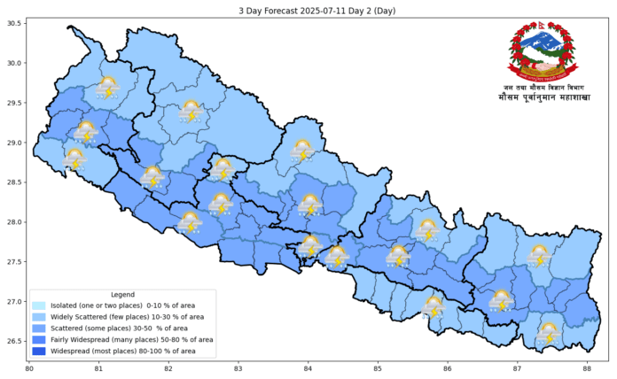 बागमती प्रदेश, गण्डकी प्रदेश र लुम्बिनी प्रदेश लगायत देशका पहाडी भू-भागका केही स्थानहरूमा तथा बाँकी भू-भागका थोरै स्थानहरूमा मेघगर्जन/चट्याङ सहित हल्का देखि मध्यम वर्षाको सम्भावना रहेको छ। कोशी प्रदेश, बागमती प्रदेश, गण्डकी प्रदेश र कर्णाली प्रदेशका एक-दुई स्थानमा भारी वर्षाको पनि सम्भावना रहेको छ। देशको उच्च-पहाडी तथा हिमाली भू-भागका थोरै स्थानहरूमा हल्का देखि मध्यम वर्षा/ हिमपातको सम्भावना रहेको छ।
