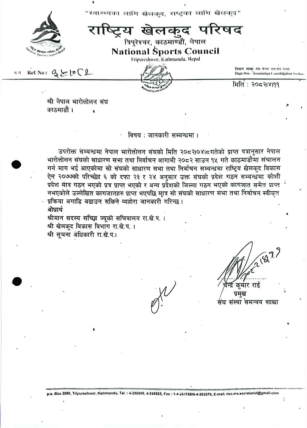 शाखाका एक कर्मचारीका अनुसार ऐनले निर्दिष्ट गरेका सम्पूर्ण प्रक्रिया पूरा गरेर कागजात पेश भएपछि मात्रै साधारणसभा र निर्वाचनको स्वीकृति दिइनेछ । जुन भारोत्तोलन संघका हकमा नियम अनुसारको प्रक्रिया पूरा गरेर कागजात पेश गर्न सकेको छैन ।