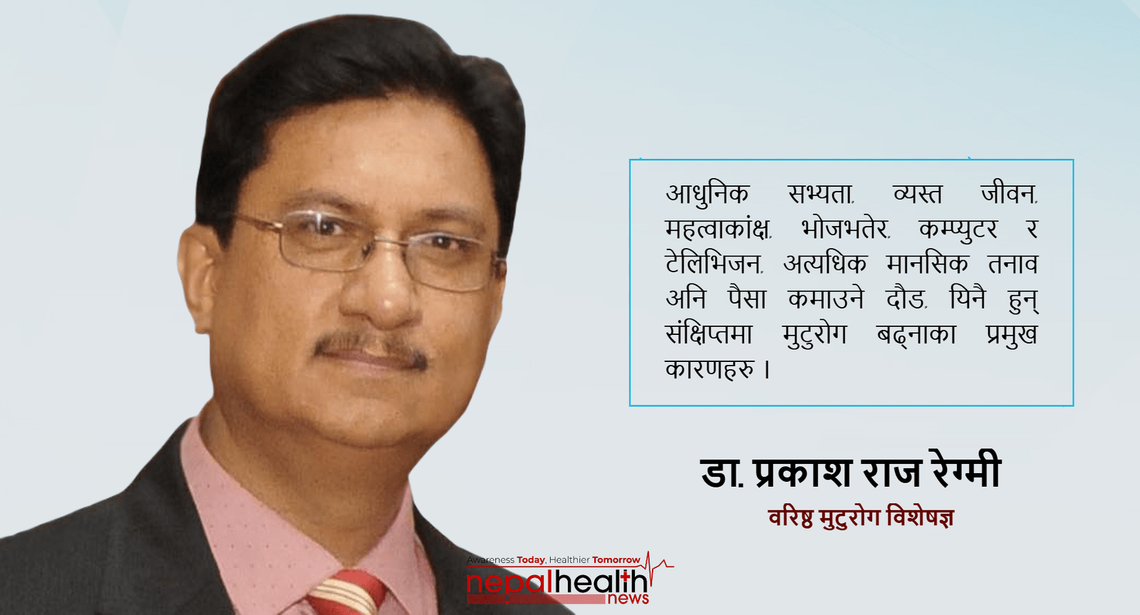 हिजो–आज उच्च रक्तचाप, मधुमेह, हृदयघात, कोलेस्टेरोल, युरिक एसिड आदिको समस्या निकै बढेको देखिन्छ । मुटुका धेरैजसो रोगहरु जीवनशैलीसँग सम्बन्धित छन् । अव्यवस्थित जीवनशैलीको नतिजा हो मुटुको रोग । आधुनिक सभ्यता, व्यस्त जीवन, महत्वाकांक्ष, भोजभतेर, कम्प्युटर र टेलिभिजन, अत्यधिक मानसिक तनाव अनि पैसा कमाउने दौड, यिनै हुन् संक्षिप्तमा मुटुरोग बढ्नाका प्रमुख कारणहरु ।