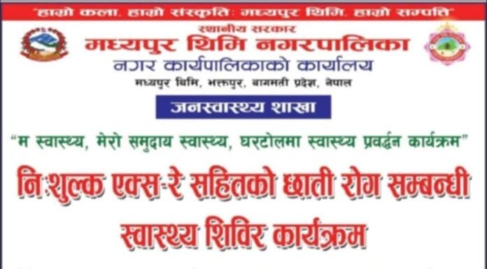 भक्तपुर । मध्यपुर थिमी नगरपालिकाद्वारा स्वास्थ प्रबर्द्धन कार्यक्रम अन्तर्गत ए आइ एक्स-रे सहितको छाती रोग सम्बन्धी नि:शुल्क स्वास्थ्य शिविर आयोजना गर्न लागेको छ । नगरपालिकाले “म स्वस्थ, मेरो समुदाय स्वस्थ, घर टोलमा स्वास्थ प्रबर्द्धन कार्यक्रम” ल्याएको हो ।