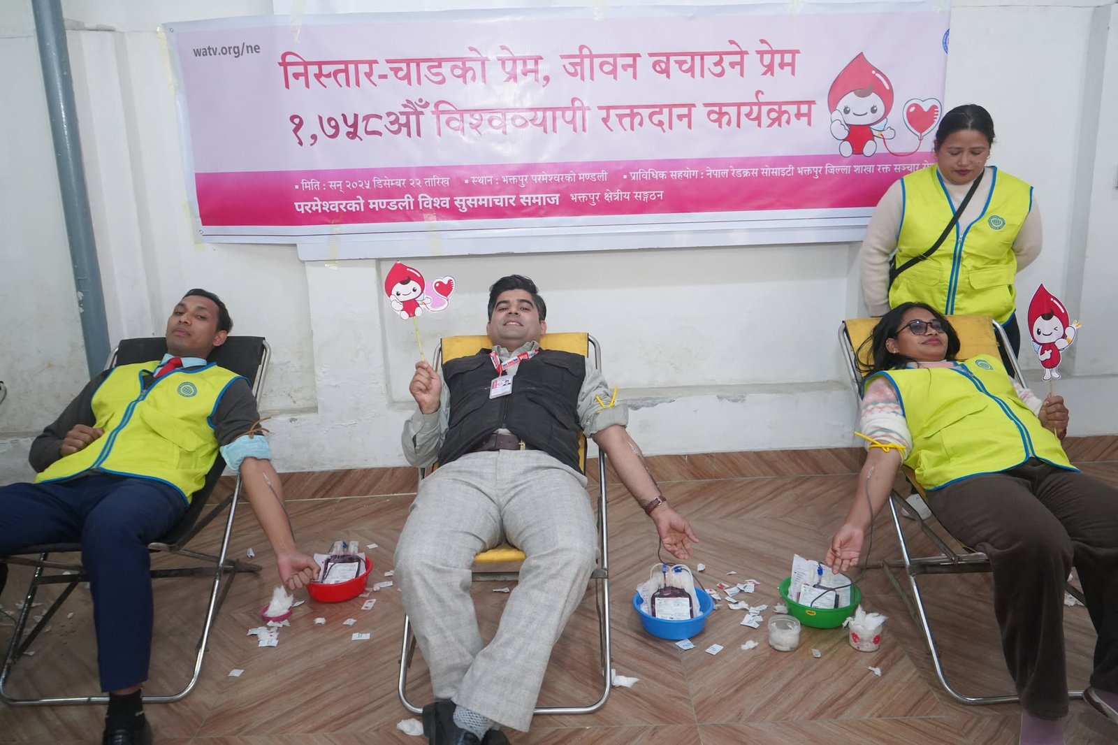 भक्तपुर । परमेश्वरको मण्डली विश्व सुसमाचार समाजले आज भक्तपुर परमेश्वरको मण्डलीमा ‘निस्तार-चाडको प्रेम, जीवन बचाउने प्रेम विश्वव्यापी रक्तदान कार्यक्रम’ आयोजना गरी छिमेकीहरूमाझ जीवन बाँड्ने कार्य सम्पन्न गरेको छ । रक्तदान कार्यक्रममा परमेश्वरको मण्डलीका विश्वासीहरू लगायत उनीहरूका परिवारहरू र छिमेकीहरू गरी करीब १५१ जना सहभागी रहेका थिए । “छिमेकीहरूको स्वस्थ दैनिक जीवन सुचारु होस् भन्ने आशा लिएर सहभागी भएको हुँ” भन्दै कार्यक्रममा सहभागी भएकाहरूले रक्तदान गरेका थिए। । रक्तदान कार्यक्रममा कुल ७३ जना पुरुष र ७८ जना महिलाले सफलतापूर्वक ५७,५,५० एमएल स्वस्थ रक्तदान गरेका थिए।