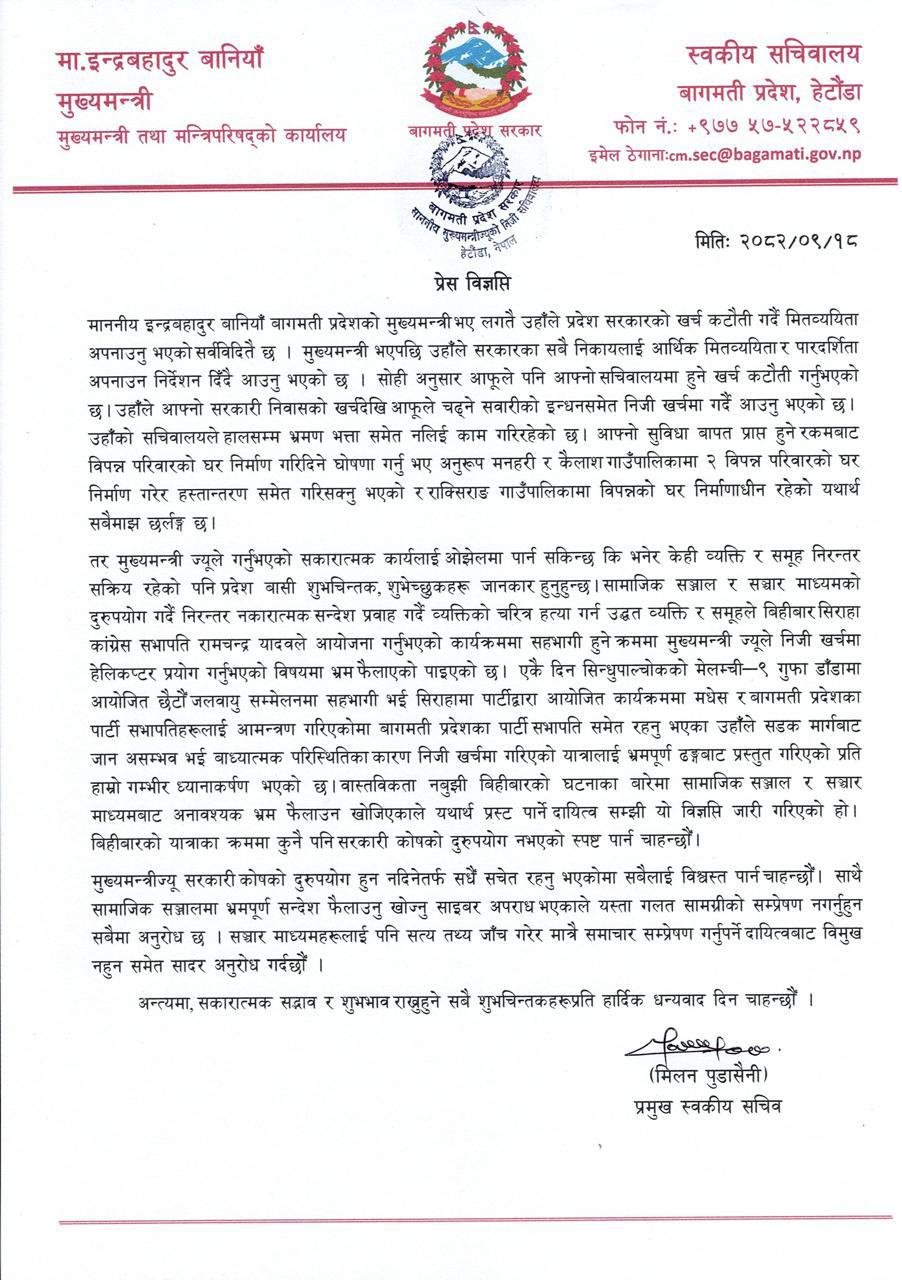 कार्यक्रममा मधेस र बागमती प्रदेशका पार्टी सभापतिहरूलाई आमन्त्रण गरिएकोमा बागमती प्रदेशका पार्टी सभापति समेत रहेका उनले सडक मार्गबाट जान असम्भव भई बाध्यात्मक परिस्थितिका कारण निजी खर्चमा हेलीकप्टर प्रयोग गरिएको हो, मुख्यमन्त्रालयको सचिवालयद्धारा जारी विज्ञप्तिमा भनिएको छ । उक्त यात्रालाई भ्रमपूर्ण ढङ्गबाट प्रस्तुत गरिएको प्रति हाम्रो गम्भीर ध्यानाकर्षण भएको छ । वास्तविकता नबुझी बिहीबारको घटनाका बारेमा सामाजिक सञ्जाल र सञ्चार माध्यमबाट अनावश्यक भ्रम फैलाउन खोजिएकाले यथार्थ प्रस्ट पार्ने दायित्व सम्झी यो विज्ञप्ति जारी गरिएको हो । बिहीबारको यात्राका क्रममा कुनै पनि सरकारी कोषको दुरुपयोग नभएको स्पष्ट पार्न चाहन्छौं । मुख्यमन्त्री सरकारी कोषको दुरुपयोग हुन नदिनेतर्फ सधैँ सचेत रहेकोमा सबैलाई विश्वस्त पार्न चाहन्छौं । साथै सामाजिक सञ्जालमा भ्रमपूर्ण सन्देश फैलाउनु खोज्नु साइबर अपराध भएकाले यस्ता गलत सामग्रीको सम्प्रेषण नगर्नुहुन सबैमा अनुरोध छ । सञ्चार माध्यमहरूलाई पनि सत्य तथ्य जाँच गरेर मात्रै समाचार सम्प्रेषण गर्नुपर्ने दायित्वबाट विमुख नहुन समेत सादर अनुरोध गर्दछौं ।