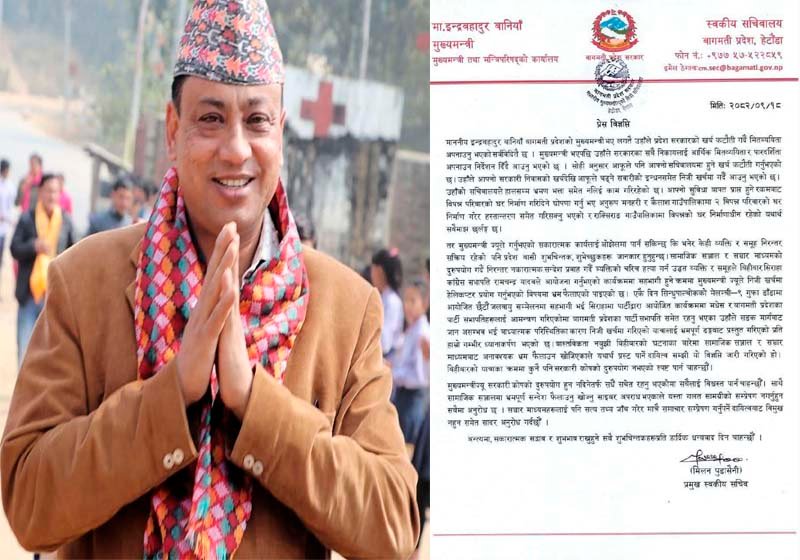 तर मुख्यमन्त्रीले गरेको सकारात्मक कार्यलाई ओझेलमा पार्न सकिन्छ कि भनेर केही व्यक्ति र समूह निरन्तर सक्रिय रहेको पनि प्रदेश बासी शुभचिन्तक, शुभेच्छुकहरू जानकार छन् । सामाजिक सञ्जाल र सञ्चार माध्यमको दुरुपयोग गर्दै निरन्तर नकारात्मक सन्देश प्रवाह गर्दै व्यक्तिको चरित्र हत्या गर्न उद्धत व्यक्ति र समूहले भ्रम फैलाएको सचिवालयले जानकारी दिएको छ ।