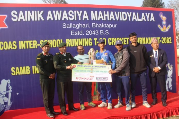 भक्तपुर । डिएभी स्कुलले प्रधानसेनापति अन्तर स्कुल टी-२० कपकाे उपाधि जितेको छ । सैनिक आवासिय महाविद्यालय सल्लाघारी भक्तपुरको आयोजनामा भएको १७ औ संस्करणको प्रधानसेनापति अन्तर स्कुल टी- २० कपकाे उपाधि जितेको हो । डिएभी स्कुल जाउलाखेलले नेपाल प्रहरी स्कुल साँगालाई ३० रनले पराजित गर्दै उपाधी चुमेको छ ।