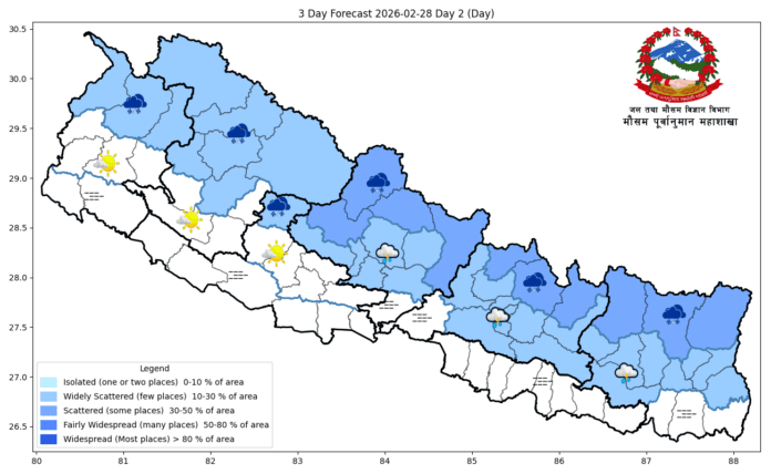 दिउँसोः तराई भू-भागका केही स्थानहरूमा बिहानको समयमा हुस्सु रहनेछ। कोशी प्रदेशका हिमाली तथा पहाडी भू-भाग सहित बाँकी हिमाली भू-भागमा साधरणतया बादल लाग्नेछ, बाँकी पहाडी भू-भागमा आंशिक बादल लाग्नेछ। तराई भू-भागमा मौसम मुख्यतया सफा रहनेछ। कोशी, बागमती र गण्डकी प्रदेशको हिमाली भू-भागका थोरै स्थानहरूमा तथा बाँकी प्रदेशका हिमाली भू-भागका एक-दुई स्थानमा मेघगर्जन/चट्याङ्ग सहित हल्का वर्षा/हिमपातको सम्भावना रहेको छ। कोशी, बागमती र गण्डकी प्रदेशका पहाडी भू-भागका समेत एक-दुई स्थानमा मेघगर्जन/चट्याङ्ग सहित हल्का वर्षाको सम्भावना रहेको छ।