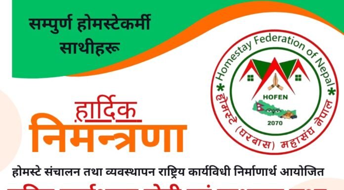 काठमाडौ । होमस्टे (घरवास) महासंघ नेपालको होमस्टे सञ्चालन तथा व्यवस्थापन सम्बन्धी राष्ट्रिय कार्यशाला गोष्ठी तथा वार्षिकसाधारण सभा हुने भएको छ । होमस्टे सञ्चालन तथा व्यवस्थापन सम्बन्धी राष्ट्रिय कार्यविधि निर्माण गर्ने उद्देश्यले आयोजना गरिएको राष्ट्रिय कार्यशाला गोष्ठी तथा वार्षिक साधारण सभा माघ १५ गतेदेखि १८ गते सम्म संचालन हुनेछ ।होमस्टे महासंघ नेपालका कोषाध्यक्ष सुरज बास्तोलाका अनुसार ४ दिन उक्त...