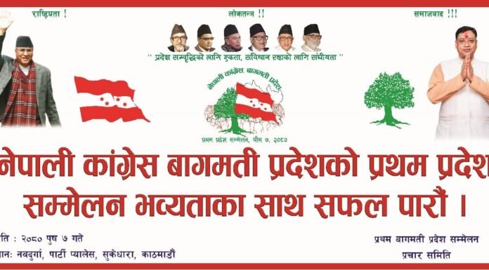 काठमाडौं । पुस ७ गते नेपाली कांग्रेसको बागमती प्रदेश सम्मेलन काठमाडौंमा हुने भएको छ। कांग्रेस बागमती प्रदेशको सम्पर्क कार्यालय काठमाडौंमा बिहीबार बसेको कार्यसम्पादन समितिको बैठकले पुस ७ गते बागमती प्रदेशको पहिलो सम्मेलन गर्ने निर्णय भएको नेपाली कांग्रेस बागमती प्रदेशका प्रवक्ता तिलक रुवालीले जानकारी दिए।कार्यसम्पादन समितिको बैठकले सम्मेलन तयारीका लागि विभिन्न समितिहरु गठन गरिएको छ । प्रदेश सभापति इन्द्रबहादुर बानियाँको...