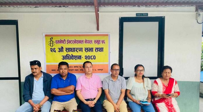 भक्तपुर । एमनेष्टी ईन्टरनेशनल नेपाल समुह-५६ को साधारण सभा तथा अधिवेशन सम्पन्न भएको छ । चाँगुनारायण नगरपालिका वडा नम्वर ६ स्थित क्वालिटी ईङ्लिस सेकेण्डरी स्कुलको प्राङ्गणमा २६ औं साधारण सभा तथा अधिवेशन सम्पन्न भएको हो । एम्नेष्टी इन्टरनेशनल नेपालको उपमहासचिव होम बहादुर अधिकारीको प्रमुख आतिथ्य, एमनेष्टी ईन्टरनेशनल नेपाल शाखाका निबर्तमान अध्यक्ष बिक्रम धुकुछु, एमनेष्टी ईन्टरनेशनल नेपाल समुह-५६ का सल्लाहकार...