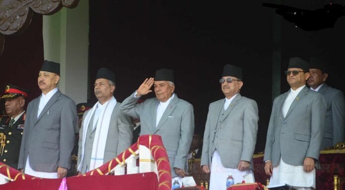 काठमाडौं : सैनिक मञ्च टुँडिखेलमा संविधान दिवस मनाइएको छ। बुधवार बिहान टुँडिखेलमा भव्य समारोहका बीच सरकारले संविधान दिवस मनाएको हो। समारोहमा राष्ट्रपति रामचन्द्र पौडेल, उपराष्ट्रपति रामसहायप्रसाद यादव, सभामुख देवराज घिमिरे, राष्ट्रिय सभाका अध्यक्ष गणेशप्रसाद तिमिल्सिना, मन्त्री, सांसद, कर्मचारी र सुरक्षा अंगका प्रमुखलगायत सहभागी थिए। समारोहमा नेपाली सेनाको टोलीले शान्तिको प्रतीक परेवा उडाएका थिए। हेलिकप्टरबाट पुष्पवृष्टि गरिनुका साथै सुरक्षा निकायका...