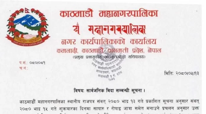 काठमाडौँ । भदौ १५ गते काठमाडौँ महानगरपालिकाले सार्वजनिक बिदा दिने निर्णय गरेको छ । सो दिन सापारु र रोपाइँ जात्रा समेत मनाउने प्रचलन अनुसार महानगरपालिका क्षेत्रभित्र सार्वजनिक बिदा दिने निर्णय भएको प्रमुख प्रशासकीय अधिकृत बसन्त अधिकारीले जारी गरेको सूचनामा उल्लेख छ । ‘काठमाडौँ महानगरपालिका स्थानीय राजपत्र संवत् २०८० भाद्र १३ गते प्रकाशित सूचना अनुसार संवत् २०८० भाद्र १५ गते...