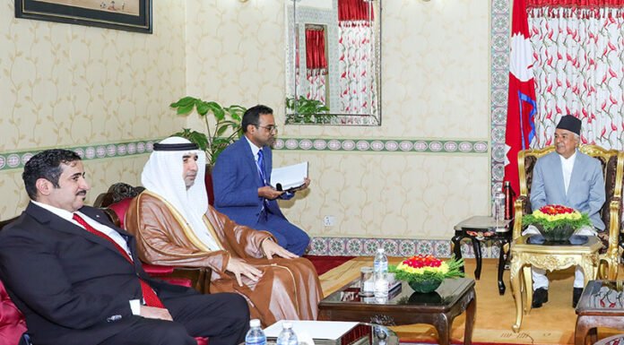 काठमाडौं : राष्ट्रपति रामचन्द्र पौडेलसँग नेपालका लागि संयुक्त अरब इमिरेट्सका राजदूत अब्दुल्ला सइद मुबारक जारवान अल-सम्शीले राष्ट्रपति भवन शीतल निवासमा मंगलबार शिष्टाचार भेट गरेका छन्।