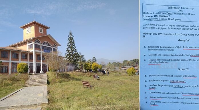 काठमाडौं : त्रिभुवन विश्वविद्यालय(त्रिवि)ले परीक्षा सञ्चालनमा अर्को चरम लापरबाही गरेको पाइएको छ। सोमबार स्नातक तह चार वर्षे ‘'इन्ट्रोडक्सन टु टुरिजम' डेभलपमेन्ट’ विषयको परीक्षामा भारतीय पाठ्यक्रमको प्रश्न सोधेपछि यतिखेर यसको चर्को आलोचना भइरहेको छ। बीए तेस्रो वर्षअन्तर्गत हिजो ‘'इन्ट्रोडक्सन टु टुरिजम' डेभलपमेन्ट’ विषयको परीक्षामा त्रिविले अर्कै विषयको प्रश्नपत्र बाँडेपछि विद्यार्थीहरू अलमलमा परेका थिए। त्यसपछि विद्यार्थीहरूले आवाज उठाए। करिब एक घण्टा...