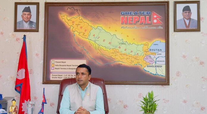 काठमाडौं । अखण्ड भारतको नक्सापछि ग्रेटर नेपालको नक्सा काठमाडौं महानगरपालिकाका मेयर बालेन शाहले सुरूमा आफ्नो कार्यकक्षमा राखेका थिए । त्यसपछि विभिन्न पालिकाका जनप्रतिनिधिले पनि बालेनको सिको गर्दै कार्यकक्षमा ग्रेटर नेपालको नक्सा राखेका थिए । साहपछि ‘ग्रेटर नेपाल’ को नक्सा बागमती प्रदेशका भौतिक पूर्वाधार विकासमन्त्री युवराज दुलाल ‘शरद’ ले कार्यकक्षमा राखेका छन् । बिहीबार मन्त्री दुलालको कार्यकक्षमा ग्रेटर नेपालको नक्सा...