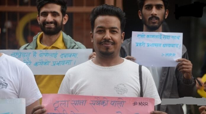 काठमाडौँ : ‘एमआरआर’ ग्रुपका सदस्यहरूले नक्कली शरणार्थी काण्डमा प्रहरी प्रशासनले गरेको कामको प्रशंसा गर्दै त्यसको समर्थनमा प्रदर्शन गरेका छन्।मंगलबार माइतीघर मण्डलामा ‘एमआरआर’ ग्रुपका सदस्य सहित कलाकार दीपकराज गिरी र निर्मल शर्मा पनि उपस्थित थिए। प्रदर्शनकारीले राम्रो कामलाई सधैं हाम्रो साथ प्रहरी प्रशासनलाई विशेष धन्यवाद, सानालाई मात्र हो त ऐन ? ठूलालाई खै त हतकडी र चेन, फेरि पनि भन्छौ...