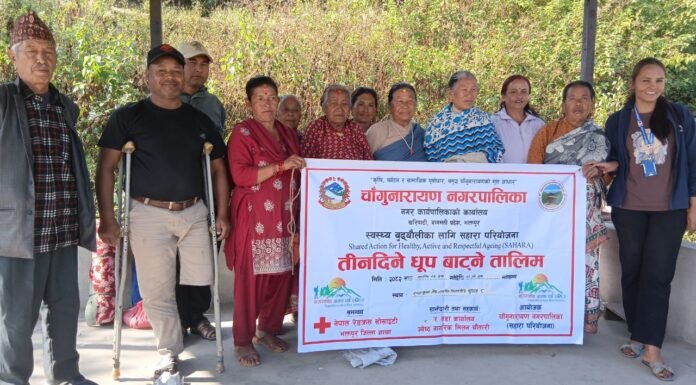 भक्तपुर । चाँगुनारायण नगरपालिका र नेपाल रेडक्रस सोसाइटी भक्तपुर जिल्ला शाखाको साझेदारीमा स्वीस रेडक्रसको आर्थिक सहयोगमा सञ्चालित स्वस्थ बुड्यौैलीका लागि सहारा परियोजना अन्तर्गत वडा नं ८ को जेष्ठ राधाकृष्ण नागरिक मिलन चौतारीको सहकार्यमा सञ्चालित तीन दिने धुप काट्ने प्रशिक्षण सम्पन्न भएको छ । कार्तिक २६ देखि २८ सम्म वडा नं ८को काशी विश्वनाथ मन्दिरसँगै रहेको सामुदायिक भवनमा सम्पन्न...