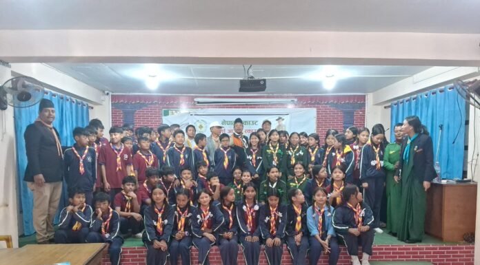भक्तपुर । भक्तपुर जिल्लाकैे पहिलो स्काउटको रुपमा दर्ता भएको आदर्श आजाद मावि,भेलुखेलमा सञ्चालित आदर्श आजाद स्काउट ट्रुपको दीक्षान्त समारोह शुक्रवार सम्पन्न भएको छ । भक्तपुर नगरपालिकाका उपप्रमुख तथा भक्तपुर नगरका प्रमुख स्काउट रजनी जोशीको प्रमुख आतिथ्यतामा भएको समारोहमा ५८ जना नयाँ विद्यार्थीहरुलाई सदस्यता बायजसहित दिक्षा दिइएको थियो ।शुक्रवार नै २० जना स्काउटहरुलाई माथिल्लो तहको बायज अर्थात बेडेन पावेल...